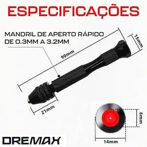 Mini Furadeira Manual Mandril Aperto Rápido 0.3 a 3.2mm Dremax - Marca: Dremax - Referência: FM00 - Furadeira manual para trabalhos delicados em joias, madeiras, circuitos, etc - Material da furadeira: Liga De Alumínio - Mandril de aperto rápido de 0.3 a 3.2mm - Furadeira com punho ergonômico - Comprimento: 90mm - Peso: 20 gramas - : 90 dias Atenção: Não é uma furadeira elétrica. É uma furadeira manual para trabalhos leves, de precisão
