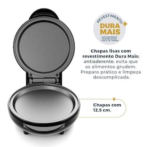 Com 550W de potência, ele prepara seus alimentos favoritos de forma rápida e eficiente. As chapas lisas antiaderentes com revestimento Dura Mais evitam que os alimentos grudem, ou seja, facilita a limpeza e deixa seus preparos douradinhos por igual.