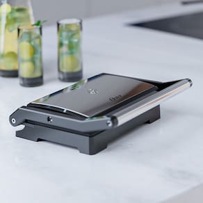 Mini Grill Elétrico Oster Inox 2 em 1. Design compacto, chapas antiaderentes, alça fria, trava para guardar e pés antiderrapantes. Pode ser usado como grill ou sanduicheira.Termostato regulável
