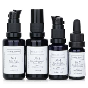 Mini kit de viagem & Edible Beauty On The Fly: 1 x leite de limpeza Belle Frais nº 1 15 ml/0,5 onças 1x Citrus Rhapsody Toner Mist 30 ml/1 oz 1x soro Exotic Goddess Ageless 10 ml/0,3 oz 1x Loção hidratante de seda de baunilha nº 4 15 ml/0,5 onças Ideal para uso pessoal e como presente