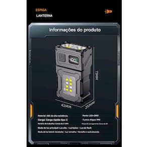A Mini Lanterna Gold Sports Led Cob Luz Dupla Super Brilhante USB 180° Com Imã Caracteristicas: Material: ABS resistente ABS, Aço e componentes eletrônicos Luz: LED + SMD Carga: carga rápida tipo C À prova d'água: IP45 Horário de trabalho: Cerca de 3-24H Tempo de carregamento: cerca de 3H Modo de luz principal: Luz alta - Luz baixa - Luz de flash Modo de luz lateral: Constante - Luz vermelha - Vermelho e azul piscando Marca: Gold Sports Grantia: 30 dias contra defeito de fabricação Características: 1.O farol pode ser girado para obter iluminação em diferentes ângulos. 2.Lanterna possui interface de saída USB, pode ser usada como banco de carregamento. 3. A lanterna tem ímã duplo forte e suporte de aço inoxidável, pode ser absorvida em metal e pendurada no bolso, liberando as mãos o uso.