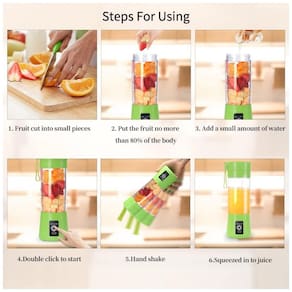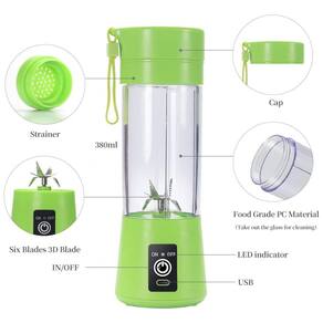 Com capacidade de 380ml e carregamento USB, possui bateria recarregável de 2000mAh que pode ser carregada por power bank, adaptador AC ou computador, com tempo de carga de 3-5 horas. Totalmente carregado, produz de 10 a 15 copos de suco, sendo perfeito para uso em casa, escritório ou ao ar livre.