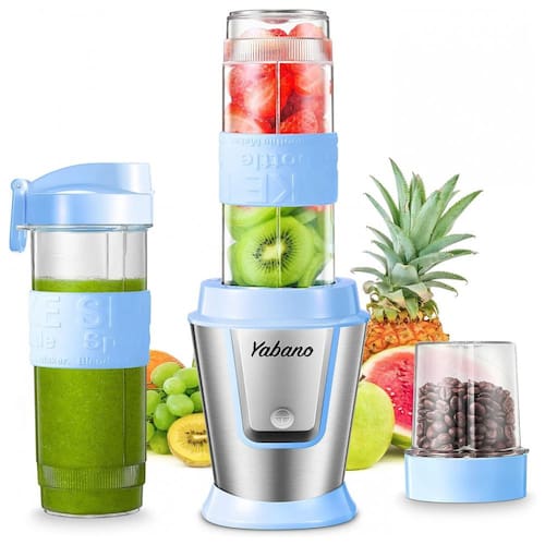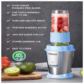 PEQUENO MAS PODEROSO Liquidificador de smoothie de tamanho compacto, projetado para pequenos espaços de bancada. Com motor potente de 500 W, é forte o suficiente para fazer suas bebidas de escolha, perfeita para shakes e smoothies diários de proteína. ON THE GO Liquidificador pessoal Yabano com 2 x garrafa de viagem de 590mL e 2 x tampa de viagem, você pode fazer sua bebida favorita e depois levar e levar. E ambas as garrafas podem caber no porta copos do carro. JARRO MOEDOR DE CAFÉ, TEMPEROS também pode ser como moedor de café, pois vem com acessório moedor de café, especiarias e lâmina para moer. É muito útil para moer sementes de café torradas em pó para fazer café fresco. UM TOQUE NO LIQUIDIFICADOR É muito fácil usar o liquidificador pessoal, basta pressionar e segurar o botão para começar a misturar ou aterrar, solte o para parar. Desfrute de bebidas caseiras saborosas e saudáveis todos os dias