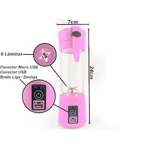 Mini Liquidificador Portátil Misturador Shake Squeeze Juice Cup Recarregável Usb 6 Lâminas Smooth Recarregável Cor: Rosa Características: Mini Liquidificador Portátil Recarregável Juice Cup Uma nova maneira de preparar Sucos, Vitaminas, Shakes e muito mais.A qualquer hora e em qualquer lugar, verdadeiramente portátil. Conta com alça de silicone para melhor transportá-lo. Você mistura e bebe na mesma garrafa. O presente ideal para amigos e para você mesmo, por ser portátil e com design revolucionário permite ser levado para academia, viagens e até mesmo em escritório. Instrução de uso: Lave as frutas, corte em pedaços pequenos coloque na garrafa, cerca de 60% do copo após adição do líquido, de modo que o volume total represente cerca de 80% do copo. Agite o produto para um melhor funcionamento, e pressione o interruptor 2 vezes seguidas para iniciar o motor, em seguida delicadamente agitar o produto. Pronto Seu maravilhoso Shake, Suco está pronto para saborear. Especificações: - Carregamento via USB do computador ou carregador de celular - Capacidade: 380ml - Motor: DC 3.7v - Rotação do motor: Carga Completa: 22000 RPM - Corrente de trabalho: 10-12A - Dimensões: 24 x 7cm Alt x Diâmetro Peso e Medida: - Peso: 0,444 g- Altura: 24 cm- Diâmetro: 7 cm Itens Inclusos: - 01 Liquidificador 6 Laminas - 01 Cabo USB - 01 Manual Marca: Negocio de genio Ean: 6012544098010