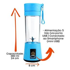 Com capacidade para 380 ml, o Mini Liquidificador Portátil possui um modelo de motor de 3,6 Vdc e uma rotação do motor de 22000 RPM sem carga e 15000 RPM com carga. Sua bateria de 3,7 Vdc possui capacidade de 2000mAh. O tempo de recarga é de aproximadamente 3 horas e o tempo de trabalho único é de 90 segundos.
