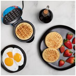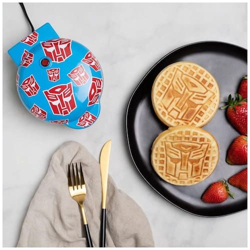 Mini máquina de waffle com tema Transformers Autobot, revestimento antiaderente, 550W, design estilizado e certificação UL®.