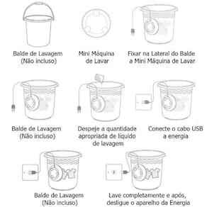 Máquina de Lavar Roupa Portátil. A cada 17 segundos muda a rotação, girando em sentido horário e anti-horário.Economia de Energia e Proteção Ambiental, em comparação com a máquina de lavar roupa convencional, este produto só precisa de uma pequena quantidade de água e pode ser limpo em 30 minutos.Fácil para transportar, cerca de 10 cm em diâmetro, cabo USB , você pode levar com você em viagens de negócios.O operação é simples, coloque o produto em um balde com água, o líquido de lavandaria, ligue na eletricidade e aguarde.Nota: Este produto não pode lavar peças grandes de roupa, como como jeans, casacos grossos, etc. Adequados para roupas finas e justas.Atenção: Produto 100% Automático. Ele Gira em sentido Horário e Anti-Horário fazendo assim a parte centrífuga.Atenção: NÃO ACOMPANHA BALDECaracterísticas do Produto:Material: Polipropileno e Componentes EletrônicosVoltagem: DC 5vPotência: 6wCapacidade de Lavagem : 1 kg Alimentação: Cabo USB, pode ligá-lo no adaptador do carregador do celular. não acompanha adaptador e o produto não é recarregável. Dimensões do Produto: 10cm x 10cmDimensões do Fio: 1 metro 80 cmConteúdo da embalagem1 Mini Maquina Lava Roupas no Balde NÃO ACOMPANHA BALDE Obs.:Imagens meramente ilustrativa 3 Meses de garantia contra defeitos de fabricação263g