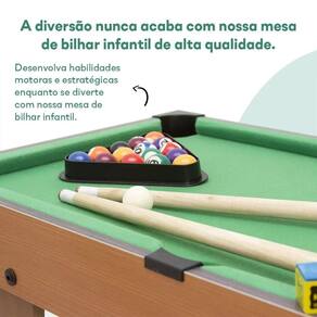 Produzida em MDF durável, reforçado e seguro, a mesa possui design compacto, fácil de montar e transportar. Acompanha 15 bolas coloridas, 1 bola branca, 2 tacos de bilhar, 1 cubo de giz e 1 triângulo.