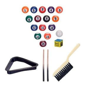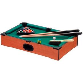 Conteúdo da embalagem: - 01 Mini Mesa Bilhar / Sinuca - 01 Triângulo - 02 Mini Tacos - 15 Bolas Coloridas Numeradas - 01 Bola Branca - 01 Escova - 01 Giz - 01 Kit de parafusos para montagem da mesa.