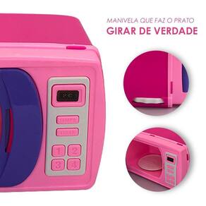 Com o mini micro-ondas, as crianças podem abrir a porta, colocar seus alimentos de brinquedo no prato giratório e simular o aquecimento e preparo de comidinhas de brincadeira com muito estilo e diversão.