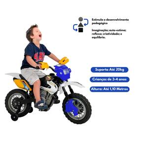 MOTO ELETRICA INFANT MOTOCROSS AZUL 241 HOMEPLAYDESCRIÇÃO DO PRODUTO:Os brinquedos elétricos são muito divertidos e radicais. Geralmente, esses produtos tendem a agitar os dias das crianças. Para tornar o brincar do seu filho muito mais seguro e divertido, a Moto Elétrica Motocross Homeplay não pode faltar em casa. CARACTERÍSTICAS DO PRODUTO:Para meninos e meninas se sentirem verdadeiros pilotos, a motinho pode ser usada em casa, parques ou no quintal de casal. Possuindo rodinhas de apoio nas laterais, funciona com bateria recarregável de 6V e suporta até 25kg. É através das horas de entretenimento que a garotada desenvolve imaginação, criatividade e socialização, por isso, garanta já a sua.ESPECIFICAÇÕES TÉCNICAS:- Marca: Homeplay- Modelo: 241- Cor: Azul- Bateria: Recarregável 6V- Recomendado à partir de 03 anosDIMENSÕES DO PRODUTO:- Comprimento do produto: 1,0 metro- Largura com as rodinhas: 53,5 cm- Altura com retrovisores: 69 cm- Peso do produto: 8,0kgITENS INCLUSOS:- 01 Moto cross elétrica 6V Infantil Azul Home PLay
