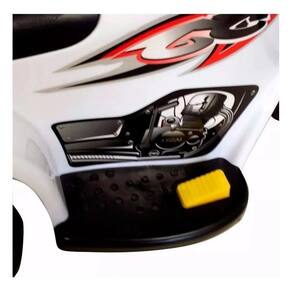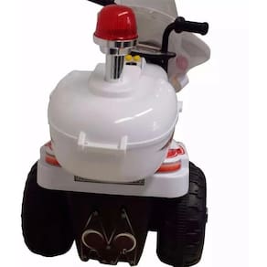 Função: frente e ré Sistema de acionamento: botão no pé Número de rodas: 3 Sistema de direção: guidão Assento: sim Apoio para os pés: sim Emite luzes: sim, farol e sirene Som de música: sim Porta objetos traseiro: sim