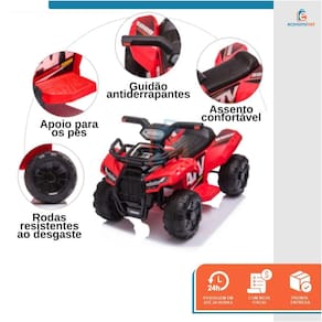 O Quadriciclo é ideal para dar aos seus filhos uma experiência de condução autêntica, para se divertir promovendo habilidades como coordenação, orientação e muito mais. Equipado com faróis e pedal de aceleração para avançar e retroceder. Possui 4 rodas largas e texturizadas, resistentes ao desgaste para garantir um passeio suave, adequado para vários tipos de solo. Basta carregar a bateria do veículo elétrico e seu filho poderá usá-la. - Faróis;- Pedal de aceleração;- Rodas largas e texturizadas;- Bateria recarregável. CARACTERÍSTICAS TÉCNICAS:Material: PP e açoMedidas: 42cm (altura) x 44cm (largura) x 66cm (comprimento)Idade recomendada: 1 a 3 anosPeso suportado: Até 20kgTempo de carregamento: 8 a 12hBateria: 6V4AHTempo de uso: 1 a 2hPeso: 6kgMarca: Baby StyleRef.: 998538