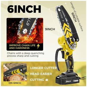 Esta mini motosserra sem fio de 6 polegadas é uma ferramenta perfeita para mães, amigas, faz tudo e mulheres que gostam de trabalhar com madeira ou de organizar o quintal. Com um comprimento de face cortável de 6 polegadas e um comprimento total de chapa de aço de 9 polegadas, você pode cortar árvores mais grossas para atender melhor às suas necessidades. A mini motosserra Saker adapta uma corrente guia de alta qualidade que passou por um processo de têmpera profunda para garantir um corte suave. Além disso, usa um motor de cobre puro, que é muito potente, aumentando a eficiência de corte de forma rápida.