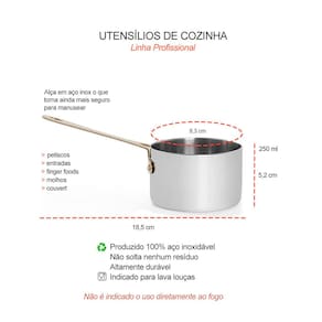Contem: 1 Mini Panela Capacidade: 250 ml Medidas: 18,5 x 8,3 cm Material: Aço Inoxidavel Peso: 183 gramas Obs: Não é indicado o uso diretamente ao fogo.