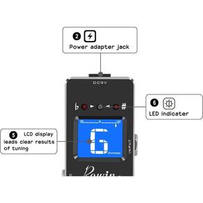 Adequado para sintonia ampla. Com visor LCD, fácil de ler informações de ajuste. True Bypass, sinal real, sem perda de sintonia. Cor: preto Material: liga de zinco Faixa de ajuste: A0 27,5Hz -C8 4186Hz Precisão: +/- 1 cent Método de Detecção: Entrada de Sinal de Áudio Método de ajuste: Auto Exposição: Tela do LCD Fonte de alimentação: DC 9V Tamanho do item: 9.5 x 4 x 5cm Peso do Item: 150g Nota: O adaptador de energia não está incluído.
