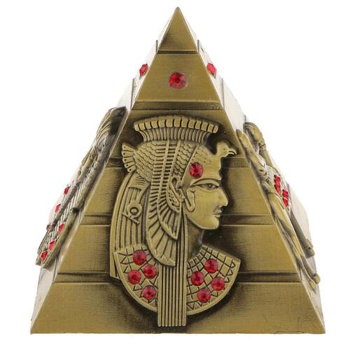 Enfeite Pirâmide Estátua Egito Decoração Escultura Metal Pirâmide Egípcia Enfeite Decoração Este item apresenta quatro faces, cada uma com um padrão distinto. Cria uma atmosfera misteriosa e de época. Produzido em metal com tonalidade Ouro Velho. Medidas de 10 cm de largura x 10 cm de altura
