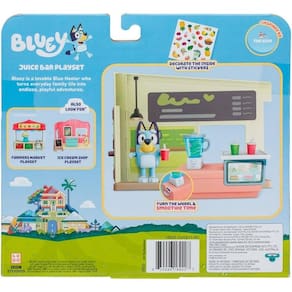 -Com este cenário encantador, as crianças podem ajudar a Bluey a escolher seu suco favorito enquanto se divertem com acessórios superfofos como balcão, copos e um liquidificador.