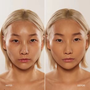 Ah, pessoas com pele oleosa também se beneficiam, viu? Como ele não é pesado, ele retira o brilho e não pesa no resultado, não evidencia marcas e remove o aspecto de oleosidade.