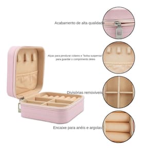 Características Principais: - Costura e acabamento de alta qualidade; - Zíper de metal resistente; - Possui duas divisórias que podem ser removidas uma a uma; - Ganchos de tecido que separam os colares; - Bolsa acoplada na tampa para suas joias não se emaranharem; - Divisórias para anéis e argolas; - Pequeno e portátil, podendo ser utilizado em viagens; - Interior em tecido, evitando que as joias manchem ou arranhem.
