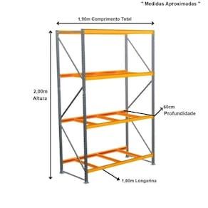 Mini Porta Pallet 1500Kg - Inicial - 2,00m x 1,80m x 60cm - 4 Níveis \nO Mini Porta Pallet Amapá é produzido em aço resistente, com capacidade de 375kg POR NÍVEL e reforço nas laterais é indicado para depósitos, estoques e exposição, como: pet shops, oficinas, lojas de materiais de construção e mini atacarejos, processos produtivos com a mais alta tecnologia do mercado e um cuidado especial em cada etapa de produção Prático e versátil dispensa o uso de empilhadeiras, onde as mercadorias são depositadas e retiradas manualmente. Além disso, é de fácil montagem, com a simples colocação de porcas e parafusos, unindo as longarinas às colunas. A pintura dos produtos é feita por meio da técnica eletrostática, com tratamento anticorrosão uniforme e resistente. A Fileira de Mini Porta Pallets deve ser iniciada com o Mini Porta Pallet INICIAL que possui 2 colunas. O Mini Porta Pallet CONTINUAÇÃO possui 1 coluna, utilizada para dar continuidade à fileira e não pode ser montada individualmente. Dimensões Aproximadas Altura: 2,00mProfundidade: 0,60mComprimento Longarina: 1,80m Comprimento Total: 1,90m " Medida Aproximada "Características Material: AçoMarca: AmapáCor: Cinza/LaranjaCapacidade por Nível: 375kg Capacidade Peso Total: 1500kgMini Porta Pallet Inicial possui 02 Laterais, indispensável para iniciar uma fileira.Modelo: Mini Porta Pallet 500kg INICIAL 3 Níveis com Inclusão 1 Par De Longarinas Contém 02 Laterais 2,00m x 0,60cm - Amapá04 Pares Longarinas 1,80m x 0,60m - AmapáObservações:Linha Mini Porta Pallets 500kg Amapá.Imagen inlustrativa para melhor identicação do produto montado. Modelo: Mini Porta Pallets 500kg INICIAL 3 Níveis Com Inclusão de 1 Par de LongarinasEntrega Via: TransportadoraPrazo: Consulte pelo CEP com nossos vendedores Garantia Contra Defeitos de Fabricação: 12 meses DevoluçãoEm até 7 dias após a chegada do produto, você tem o direito de realizar a devolução. Mas para isso, a mercadoria não deve ter sido montada, utilizada e danificada.Horário de AtendimentoSegunda a Sexta-feira, das 13:00h às 17:00h.Dúvidas, Informações, Consulte Nossos Vendedores Via WhatsApp.\nFicha Técnica\nCódigo 1451\nModelo Linha Mini Porta Pallet 500kg\nCategoria Mini Porta Pallet Amapá\nMarca Amapá Metalúrgica\nItens Inclusos 02 Laterais 2,00m x 60cm - Amapá04 Pares Longarinas 1,80m x 0,60m - Amapá\nGarantia 1 ano após o recebimento do produto\nDisponibilidade Disponível em 3 dias úteis
