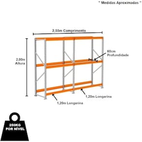 Mini Porta Pallet 250kg 1 Inicial 1 Continuação 2,55m Comprimento - 2,00m x 1,20m x 60cm Amapá O Mini Porta Pallet é produzido em aço resistente, com capacidade de 250kg POR NÍVEL e reforço nas laterais é indicado para depósitos, estoques e exposição, como: pet shops, oficinas, lojas de materiais de construção e mini atacarejos. Prático e versátil dispensa o uso de empilhadeiras, onde as mercadorias são depositadas e retiradas manualmente. Além disso, é de fácil montagem, com a simples colocação de porcas e parafusos, unindo as longarinas às colunas. A pintura dos produtos é feita por meio da técnica eletrostática, com tratamento anticorrosão uniforme e resistente. Os Mini Porta Pallets possuem qualidade, resistência e durabilidade garantidas pelo uso de matérias-primas de alto padrão, processos produtivos com a mais alta tecnologia do mercado e um cuidado especial em cada etapa de produção. Dimensões Aproximadas Altura: 2,00mProfundidade: 0,60mComprimento Longarina: 1,20m Comprimento Total Montada: 2,55m " Medida Aproximada " Características Material: AçoMarca: AmapáCor: Cinza/LaranjaCapacidade por Nível: 250kgCapacidade Peso Total: 1500kg Mini Porta Pallet Inicial possui 02 laterais, indispensável para iniciar uma fileira. Mini Porta Pallet Continuação possui 01 lateral, utilizado para dar continuidade à fileira e não pode ser montado individualmente. Contém 03 Laterais 2,00m x 0,60m - Amapá06 Pares Longarinas 1,20m x 0,60m - Amapá Entrega Via: TransportadoraPrazo: Consulte pelo CEP com nossos vendedores Garantia Contra Defeitos de Fabricação: 12 meses DevoluçãoEm até 7 dias após a chegada do produto, você tem o direito de realizar a devolução. Mas para isso, a mercadoria não deve ter sido montada, utilizada e danificada.Horário de AtendimentoSegunda a Sexta-feira, das 13:00h às 17:00h.Dúvidas, Informações, Consulte Nossos Vendedores Via WhatsApp.\nFicha Técnica\nCódigo AMP0165\ncódigo de barras 7899119800327\nModelo Linha Mini Porta Pallet 250kg\nCategoria Mini Porta Pallet Amapá\nMarca Amapá Metalúrgica\nItens Inclusos 03 Laterais 2,00m x 0,60m - Amapá06 Pares Longarinas 1,20m x 0,60m - Amapá\nGarantia 1 ano após o recebimento do produto\nDisponibilidade Disponível em 2 dias úteis\nInformação adicional Dúvidas, Informações, Consulte Nossos Vendedores Via WhatsApp.