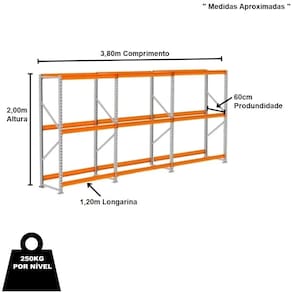 Mini Porta Pallet 250kg 1 Inicial 2 Continuações 3,80m Comprimento - 2,00m x 1,20 x 0,60cm O Mini Porta Pallet é produzido em aço resistente, com capacidade de 250kg POR NÍVEL e reforço nas laterais é indicado para depósitos, estoques e exposição, como: pet shops, oficinas, lojas de materiais de construção e mini atacarejos. Prático e versátil dispensa o uso de empilhadeiras, onde as mercadorias são depositadas e retiradas manualmente. Além disso, é de fácil montagem, com a simples colocação de porcas e parafusos, unindo as longarinas às colunas. A pintura dos produtos é feita por meio da técnica eletrostática, com tratamento anticorrosão uniforme e resistente. Os Mini Porta Pallets possuem qualidade, resistência e durabilidade garantidas pelo uso de matérias-primas de alto padrão, processos produtivos com a mais alta tecnologia do mercado e um cuidado especial em cada etapa de produção.Dimensões Aproximadas Altura: 2,00mProfundidade: 0,60m Comprimento Longarina: 1,20mComprimento Montada: 3,80m " Medida Aproximada " Características Material: AçoMarca: AmapáCor: Cinza/LaranjaCapacidade por Nível: 250kgCapacidade Peso Total : 2250kgContém 04 Laterais 2,00m x 60cm - Amapá09 Pares Longarinas 1,20m x 60cm - Amapá Entrega Via: TransportadoraPrazo: Consulte pelo CEP com nossos vendedores Garantia Contra Defeitos de Fabricação: 12 meses DevoluçãoEm até 7 dias após a chegada do produto, você tem o direito de realizar a devolução. Mas para isso, a mercadoria não deve ter sido montada, utilizada e danificada.Horário de AtendimentoSegunda a Sexta-feira, das 13:00h às 17:00h.Dúvidas, Informações, Consulte Nossos Vendedores Via WhatsApp.\nFicha Técnica\nCódigo AMP0164\ncódigo de barras 7899119800327\nModelo Linha Mini Porta Pallet 250kg\nCategoria Mini Porta Pallet Amapá\nMarca Amapá Metalúrgica\nItens Inclusos 04 Laterais 2,00m x 0,60m - Amapá09 Pares Longarinas 1,20m x 60m - Amapá\nGarantia 1 ano após o recebimento do produto\nDisponibilidade Disponível em 2 dias úteis\nInformação adicional Dúvidas, Informações, Consulte Nossos Vendedores Via WhatsApp.