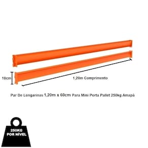 KIT Mini Porta Pallet 250kg Inicial 3,00m Altura x 1,20m Comprimento x 60cm Profundidade 4 Níveis Amapá O Mini Porta Pallet é produzido em aço resistente, com capacidade de 250kg por Nível e reforço nas laterais é indicado para depósitos, estoques e exposição, como: pet shops, oficinas, lojas de materiais de construção e mini atacarejos. Prático e versátil dispensa o uso de empilhadeiras, onde as mercadorias são depositadas e retiradas manualmente. Além disso, é de fácil montagem, com a simples colocação de porcas e parafusos, unindo as longarinas às colunas. A pintura dos produtos é feita por meio da técnica eletrostática, com tratamento anticorrosão uniforme e resistente. Os Mini Porta Pallets possuem qualidade, resistência e durabilidade garantidas pelo uso de matérias-primas de alto padrão, processos produtivos com a mais alta tecnologia do mercado e um cuidado especial em cada etapa de produção.A Fileira de Mini Porta Pallets deve ser iniciada com o Mini Porta Pallet INICIAL que possui 2 colunas. O Mini Porta Pallet CONTINUAÇÃO possui 1 coluna, utilizada para dar continuidade à fileira e não pode ser montada individualmente. Dimensões Aproximadas Altura: 3,00mProfundidade: 0,60mComprimento Longarina: 1,20mComprimento Total: 1,30m " Medida Aproximada "Características Material: AçoCor: Cinza/LaranjaCapacidade Por Nível. 250kgCapacidade Peso Total 1000kgContém 02 Laterais 3,00m x 0,60m - Amapá04 Pares Longarinas 250kg 1,20m x 0,60m - Amapá Entrega Via: TransportadoraPrazo: Consulte pelo CEP com nossos vendedores Garantia Contra Defeitos de Fabricação: 12 meses DevoluçãoEm até 7 dias após a chegada do produto, você tem o direito de realizar a devolução. Mas para isso, a mercadoria não deve ter sido montada, utilizada e danificada.Horário de AtendimentoSegunda a Sexta-feira, das 13:00h às 17:00h.Dúvidas, Informações, Consulte Nossos Vendedores Via WhatsApp.\nFicha Técnica\nCódigo 1547\nModelo Linha Mini Porta Pallet 250kg\nCategoria Mini Porta Pallet Amapá\nMarca Amapá Metalúrgica\nItens Inclusos 02 Laterais 3,00m x 0,60m - Amapá04 Pares Longarinas 250kg 1,20m x 0,60m - Amapá\nGarantia 1 ano após o recebimento do produto\nDisponibilidade Disponível em 3 dias úteis
