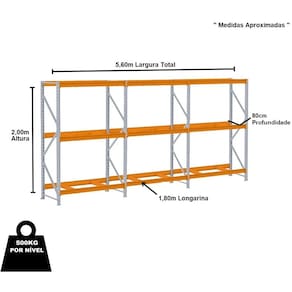 Kit Mini Porta Pallet 500kg 1 Inicial + 2 Continuações 5,60m Comprimento - 2,00m x 1,80m x 0,80cm O Mini Porta Pallet é produzido em aço resistente, com capacidade de 500kg por nível e reforço nas laterais é indicado para depósitos, estoques e exposição, como: pet shops, oficinas, lojas de materiais de construção e mini atacarejos. Prático e versátil dispensa o uso de empilhadeiras, onde as mercadorias são depositadas e retiradas manualmente. Além disso, é de fácil montagem, com a simples colocação de porcas e parafusos, unindo as longarinas às colunas. A pintura dos produtos é feita por meio da técnica eletrostática, com tratamento anticorrosão uniforme e resistente. Os Mini Porta Pallets possuem qualidade, resistência e durabilidade garantidas pelo uso de matérias-primas de alto padrão, processos produtivos com a mais alta tecnologia do mercado e um cuidado especial em cada etapa de produção. A Fileira de MINI PORTA PALLETS deve ser iniciada com o Mini Porta Pallet INICIAL que possui 2 colunas. O Mini Porta Pallets CONTINUAÇÃO possui 1 coluna, utilizada para dar continuidade à fileira e não pode ser montada individualmente. Dimensões Aproximadas Altura: 2,00mProfundidade: 0,80mComprimento Longarina: 1,80m Comprimento Total: 5,60m "Media Aproximada"Características Material: AçoMarca: AmapáCor: Cinza/LaranjaCapacidade por Nível: 500kgCapacidade Peso Total: 4500kg Mini Porta Pallet Inicial possui 02 laterais, indispensável para iniciar uma fileira. Mini Porta Pallet Continuação possui 01 lateral, utilizado para dar continuidade à fileira e não pode ser montado individualmente. Contém 04 Laterais 2,00m x 0,80m - Amapá09 Pares Longarinas 1,80m x 0,80m – Amapá Entrega Via: TransportadoraPrazo: Consulte pelo CEP com nossos vendedoresGarantia Contra Defeitos de Fabricação: 12 meses DevoluçãoEm até 7 dias após a chegada do produto, você tem o direito de realizar a devolução. Mas para isso, a mercadoria não deve ter sido montada, utilizada e danificada.Horário de AtendimentoSegunda a Sexta-feira, das 13:00h às 17:00h.Dúvidas, Informações, Consulte Nossos Vendedores Via WhatsApp.\nFicha Técnica\nCódigo AMP041\nModelo Linha Mini Porta Pallet 500kg\nCategoria Mini Porta Pallet Amapá\nMarca Amapá Metalúrgica\nItens Inclusos 04 Laterais 2,00m x 0,80m - Amapá09 Pares Longarinas 1,80m x 0,80m Amapá\nGarantia 1 ano após o recebimento do produto\nDisponibilidade Disponível em 2 dias úteis\nInformação adicional Dúvidas, Informações, Consulte Nossos Vendedores Via WhatsApp.