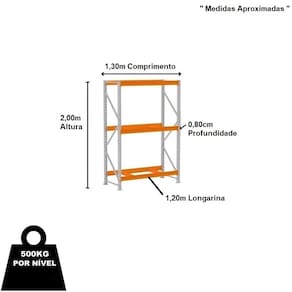 Mini Porta Pallet 500Kg - Inicial - 2,00m x 1,20m x 0,80cm O Mini Porta Pallet é produzido em aço resistente, com capacidade de 500 kg por nível e reforço nas laterais é indicado para depósitos, estoques e exposição, como: pet shops, oficinas, lojas de materiais de construção e mini atacarejos. Prático e versátil dispensa o uso de empilhadeiras, onde as mercadorias são depositadas e retiradas manualmente. Além disso, é de fácil montagem, com a simples colocação de porcas e parafusos, unindo as longarinas às colunas. A pintura dos produtos é feita por meio da técnica eletrostática, com tratamento anticorrosão uniforme e resistente. Os Mini Porta Pallets possuem qualidade, resistência e durabilidade garantidas pelo uso de matérias-primas de alto padrão, processos produtivos com a mais alta tecnologia do mercado e um cuidado especial em cada etapa de produção.A Fileira de Mini Porta Pallets deve ser iniciada com a Mini Porta Pallet INICIAL que possui 2 colunas. O Mini Porta Pallet CONTINUAÇÃO possui 1 coluna, utilizada para dar continuidade à fileira e não pode ser montada individualmente.Dimensões Aproximadas Altura: 2,00mProfundidade: 0,80mLargura Longarina: 1,20m Comprimento Total Montado: 1,30m " Medida Aproximada "Características Material: AçoCor: Cinza/LaranjaCapacidade por Nível: 500kgCapacidade Peos Total: 1500kg Mini Porta Pallet INICIAL possui 02 Laterais, indispensável para INICIAR uma fileira. Contém 02 Laterais 2,00m x 0,80m - Amapá03 Pares Longarinas 1,20m x 0,80m - Amapá Entrega Via: TransportadoraPrazo: Consulte pelo CEP com nossos vendedores Garantia Contra Defeitos de Fabricação: 12 meses DevoluçãoEm até 7 dias após a chegada do produto, você tem o direito de realizar a devolução. Mas para isso, a mercadoria não deve ter sido montada, utilizada e danificada.Horário de AtendimentoSegunda a Sexta-feira, das 13:00h às 17:00h.Dúvidas, Informações, Consulte Nossos Vendedores Via WhatsApp.\nFicha Técnica\nCódigo AMP0118\nModelo Linha Mini Porta Pallet 500kg\nCategoria Mini Porta Pallet Amapá\nMarca Amapá Metalúrgica\nItens Inclusos 02 Laterais 2,00m x 0,80m - Amapá03 Pares Longarinas 1,20m x 0,80m - Amapá\nGarantia 1 ano após o recebimento do produto\nDisponibilidade Disponível em 2 dias úteis\nInformação adicional Dúvidas, Informações, Consulte Nossos Vendedores Via WhatsApp.