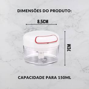 Mini processador manual de 150 ml, ideal para cortar e processar alimentos em pequenas quantidades. Feito em plástico, com design compacto e prático. Medidas: 8,5cm x 7,0cm (altura x largura). Peso líquido: 151 gramas.Acessórios