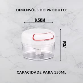 Mini processador manual de temperos com capacidade de 150 ml. Ideal para pequenas porções. Feito em plástico, com design compacto e prático. Inclui 1 peça. Medidas: 8,5cm x 7,0cm (largura x altura). Peso líquido: 151 gramas.Acessórios
