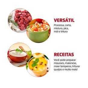 - VERSATILIDADE DE RECEITAS: O mini processador Mondial processa, corta, mistura, pica, mói e tritura. Você pode preparar mousses, maionese, moer temperos, triturar queijos e muito mais.