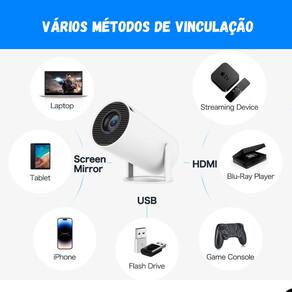 Sistema Android integrado: acesso a aplicativos compatíveis diretamente no projetor. Conectividade: Wi-Fi para streaming e Bluetooth para áudio sem fio. Imagem: reprodução em Full HD com compatibilidade para conteúdo 4K (decodificação). Portabilidade: design compacto para facilitar o transporte e a instalação. Uso versátil: indicado para entretenimento, estudos e apresentações rápidas. Especificações técnicas