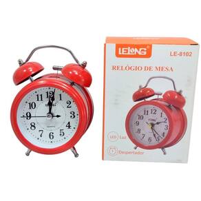INFORMAÇÕES TÉCNICAS: Marca: Lelong / Modelo: LE-8102 Material: Ferro + ABS + Componentes Eletrônicos Funções: Horário e Despertador Formato: Retrô Tipo do Som: Sino Despertador Mecânico Alimentação: 1 Pilha AA Inclusa Peso aproximado: 160g Medidas aproximadas: 12cm x 8cm x 5.2cm Com Luz