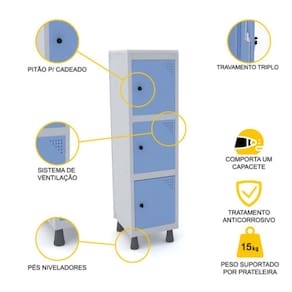 Ideal para ambientes que necessitam de organização e segurança, este mini roupeiro conta com tranca segura em cada porta, permitindo o uso de cadeado. Sua estrutura é resistente, com base confeccionada em chapa de aço 24 e prateleiras em chapa de aço 26, ambas com tratamento anticorrosivo que aumenta a durabilidade. O sistema de ventilação com furos facilita a circulação de ar, enquanto os pés nivelados garantem estabilidade.