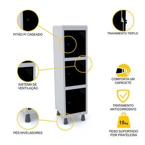 3- O que é um pitão para cadeado? Cada porta possui tranca segura, na forma de uma lingueta, possibilitando travamento triplo. Para acrescer a segurança do roupeiro, cada porta possui um pitão, que é uma peça em nylon e fibra de vidro na cor preta onde pode ser colocado um cadeado individual.