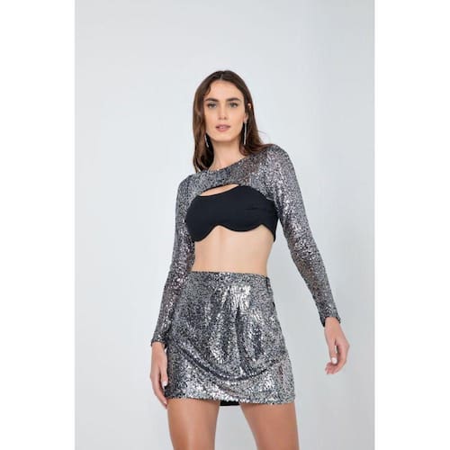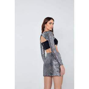Mini Saia Feminina Justa tendo Sua Composição Entre Poliéster e Elastano. A Saia Justa é toda De Paetê Prata. Perfeito para Brilhar em qualquer Momento que você quiser, Cheio de Feminilidade e Estilo. Coleção Imagine Outono Inverno 23. Flor de Lis.