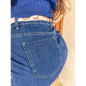 A saia na imagem é uma minissaia jeans com lavagem escura e cintura alta. Ela tem um corte reto e justo ao corpo, com bolsos na parte da frente que adicionam um detalhe funcional e um cinto de tecido colorido amarrado na cintura, que não é parte da saia, mas complementa o visual. A barra da saia é simples e sem detalhes, como desfiados. Marca: Não Informado