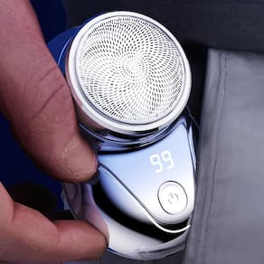 Especificação Material: Liga Cor: azul Peso: 120 g Tamanho do produto: 9,5 x 4,9 x 10 cm Lista de embalagem: 1 x barbeador elétrico portátil Mini Shaver 1 x cabo de dados Design compacto e portátil - O mini corpo de bolso cabe facilmente na bagagem ou no carro para uma viagem conveniente. Motor de alta velocidade — o motor de 7000 RPM garante um barbear suave e eficiente sem puxões ou irritações. Display LED inteligente - O display digital integrado mostra claramente o nível da bateria para carregamento oportuno. Recarregável por USB — Design de carregamento USB universal compatível com bancos de energia, laptops e carregadores de carro. Impermeável e fácil de limpar — a classificação IPX6 à prova d'água permite a lavagem do corpo inteiro para uma manutenção sem complicações.
