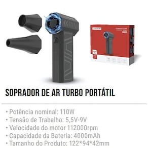 Mini soprador de ar portátil com motor de 112.000 RPM e 110W de potência. Possui bateria interna recarregável via USB-C e design ergonômico sem fio.Tipo