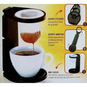 Mini suporte dobrável café expresso + refil mini coador Nosso empenho é procurar o que há de mais atual e funcional no mundo culinário e para organização da sua casa, priorizando sempre a qualidade e a versatilidade dos produtos. Mini suporte de café dobrável + refil mini coador Com o mini suporte dobrável, individual e coador de pano, você faz aquele maravilhoso cafezinho mais fresquinho e saboroso com um cheirinho irresistível como antigamente. Por ser dobrável, fácil de montar e compacto pode ser levado para vários ambientes que você desejar Sirva seu café com o gosto que somente o coador de pano pode oferecer, uma verdadeira delícia.Super prático, fácil de montar, moderno e compacto, seu café fresquinho, pronto em segundos.O kit suporte acompanha 1 pacote de refil mini coador, com 2 unidades.Não acompanha xícara, imagem ilustrativa. Medidas: Altura do coador: 08cm Diâmetro do coador: 07cm Altura do suporte: 17cm Diâmetro do suporte: 11cm Conteúdo da embalagem: 1 suporte dobrável com mini coador 1 pacote refil mini coador com 2 unidades Gostou Esse produto pode ser seu aguardamos sua compra