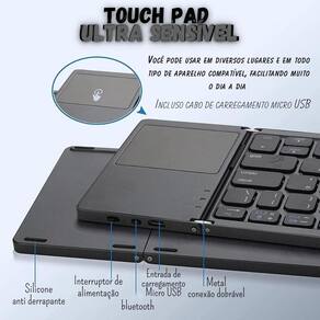 -------------- Especificações -------------- Altura: 10cm Largura: 30 cm. Teclado fechado: 15 cm. Conector: micro usb. Configuração: abnt 1 Distância de trabalho: 10m. Conexão: via bluetooth. Economia de bateria: após 10 minutos de inatividade. Peso: 190g. -------------- Conteúdo -------------- 1x teclado. 1x cabo de carregamento. 1x manual.