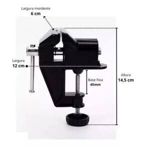 Tamanho aproximado do torno: 14,5x11,5x6cm Largura do mordente 150mm 5 polegadas Peso aproximado: 145g Tipo de produto: mini torno / morsa de bancada base fixa 45mm hutz Cor: preto e prata Composição: liga de aluminio e pp