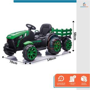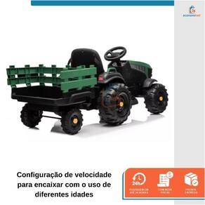 O Trator com reboque extra grande é o presente ideal para trazer diversão para o seu filho. Adequado para pastagem, estrada de asfalto, calçada e entrada de tijolos, com 2 velocidades, equipado com mp3 player, rádio, porta usb, cinto de segurança ajustável para uso seguro e confortável. Conta ainda com bateria recarregável para permitir horas de reprodução. CARACTERÍSTICAS TÉCNICAS:Material: PP e ferroMedidas: 63,5cm (altura) x 66,04cm (largura) x 154,9cm (comprimento)Idade recomendada: de 3 a 8 anosPeso suportado: Até 28kgVelocidade: 5 a 7km/hTempo de carregamento: 8 a 12hTempo de duração: 1 a 2hTipo de batería: 24V 7ahMotor: 200W * 2Marca: Baby StyleRef.: 998537 O pacote inclui:1 x trator1 x carregador1 x manual