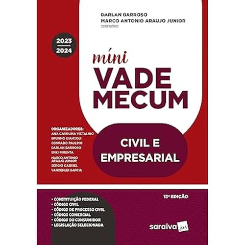 Data de Fechamento da obra: 28-8-2023.A obra Míni Vade Mecum Civil eEmpresarial, chega à 13.ª edição, com seus maioresdiferenciais:- Em conformidade com os principais editais deconcursos, inclusive do Exame da OAB- Material preparado com orientação acadêmica epedagógica de professores com larga experiência em Exame da OAB- Legislação com remissões estratégicas, semjurisprudência ou doutrina (de acordo com o permitido pelo edital da OAB)- Súmulas do STF e STJ (nãocomentados nem comparados)- Índices alfabético-remissivos, sem estrutura depeças processuais- Projeto gráfico diferenciado, com cabeçalhos queindicam as normas e os artigos- Papel que permite grifos ou marcações - Saraiva Conecta ¿ plataformade conteúdos complementares ao livro (serviço Atualize seu Código ¿ atualizaçãoaté junho de 2024 ¿ e material extra). Recomendamosque o material seja utilizado em conjunto com o Vade Mecum OAB & Concursos.