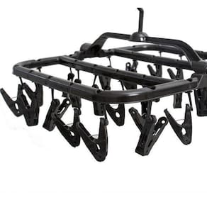 Características: - contém 26 prendedores de roupa. - possui suporte para ser pendurado. - dobrável. - cor: preto. - economiza espaço. - material leve e prático. - fácil armazenamento. - dimensões: 01 varal a 27cm x l 32,5cm x p 33cm, com 4 correntinhas, 1 suporte e 26 prendedores. - suporta: 0,500 kg - composição: estrutura do produto: polipropileno / mola: aço