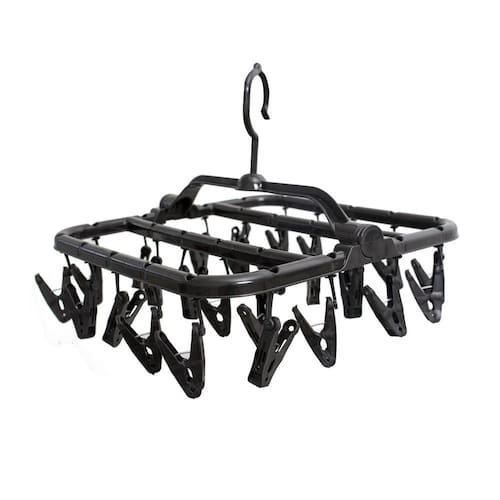 Características: - contém 26 prendedores de roupa. - possui suporte para ser pendurado. - dobrável. - cor: preto. - economiza espaço. - material leve e prático. - fácil armazenamento. - dimensões: 01 varal a 27cm x l 32,5cm x p 33cm, com 4 correntinhas, 1 suporte e 26 prendedores. - suporta: 0,500 kg - composição: estrutura do produto: polipropileno / mola: aço