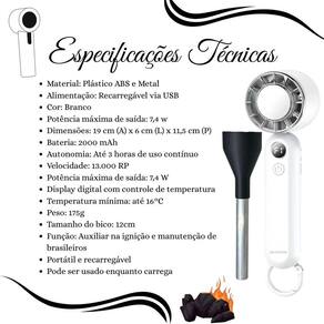 .Refrigeração eficiente com temperatura mínima de 16C .Potente fluxo de ar para acender o carvão rapidamente .Três velocidades ajustáveis .Motor potente com 13.000 RPM .Display digital para controle rápido e intuitivo .Bateria de 2000 mAh com até 3 horas de uso .Pode ser utilizado enquanto carrega .Leve, portátil e fácil de transportar .Design moderno na cor branca .Ideal para churrasqueiras, lareiras e fornos a lenha Marca: Não Informado