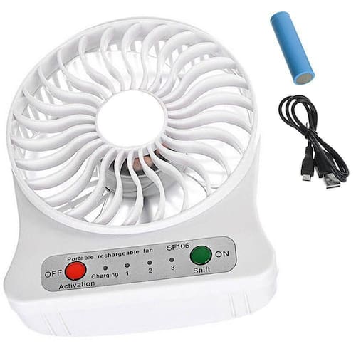 Mini-ventilador De Mesa Branco Eiyo Descrição Mini-ventilador de mesa com bateria recarregável. Conector USB, possibilitando a recarga qualquer fonte de energia com entrada USB. Características do Produto Aviso sobre o produto: Imagem ilustrativa. Modo de velocidade: 3 faixas. Potência de saída max : 4,5 W. Tempo de Trabalho: 2 à 4 h. Especificação da Bateria: 18650li-ion. Instalação da Bateria: Removível. Tempo de Carregamento h : 5. Tamanho: 5,14,11,5polegadas. Peso Líquido: 188 g. Carregador: entrada 100-240vac. Output: 5 v/1a DC. País de Origem: China